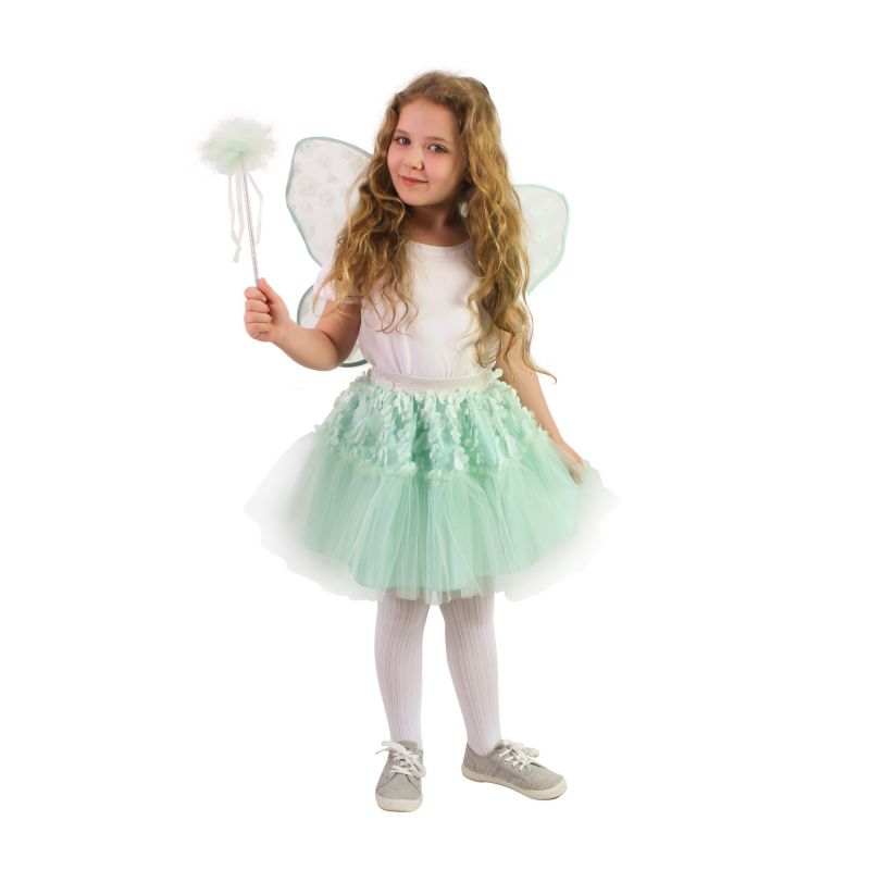 Dětský kostým Tatu motýlí víla zelená.Krásná vílí sada pro malé holčičky! Sada obsahuje zelenou tylovou TUTU sukýnku se saténovou spodničkou. Sukně je zdobena drobnými květinkami a stříbrnou gumou v pase, k tomu perfektně sladěná křídla a hůlka ve stejném motivu. Sukně je dlouhá cca 35 cm a je vhodná pro obvod pasu 50-60 cm. Určeno pro holčičky ve věkovém rozmezí 3-10 let (104-146 cm).