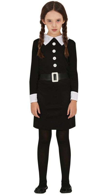 Každá malá slečna se může stát ikonickou Wednesday Addams s tímto nádherným kostýmem inspirovaným populárním seriálem. Černé šaty s dlouhým rukávem, bílým límečkem a páskem přesně odpovídají stylu této tajemné hrdinky. Bez potisku, jednoduchý, ale výrazný design dodává outfitu správnou dávku elegance a temné atmosféry. Kostým je ideální na Halloween, karnevaly, tematické večírky nebo školní vystoupení. Pohodlný materiál zajistí příjemné nošení po celý den.