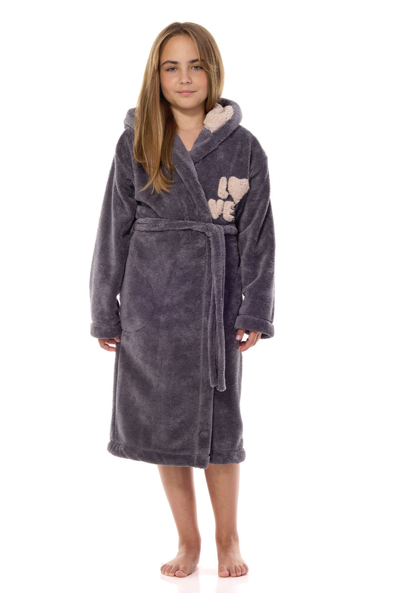 Dětský župan s kapucí, vyrobený z měkkého, na dotek velmi příjemného měkkého úpletu. Zavazování v pase. Pohodlné kapsy na úrovni boků. Nášivka s nápisem LOVE na hrudi. Složení: 100% polyester