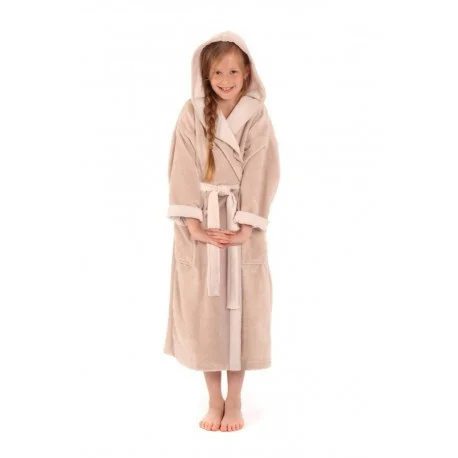 Dětský jemný savý župan s kapucí a kapsami.  Kolekce Tampa patří již několik let mezi nejoblíbenější u všech věkových skupin. Skvělý funkční materiál kombinuje vlastnosti jemné česané bavlny ve smyčkách na rubové straně a lehkého, nadýchaného veluru v mikrovláknu na lícové straně. Má vynikající absorpční schopnost, je hebký na omak, lehký a velmi snadno se udržuje. Je barevně i tvarově stálý.