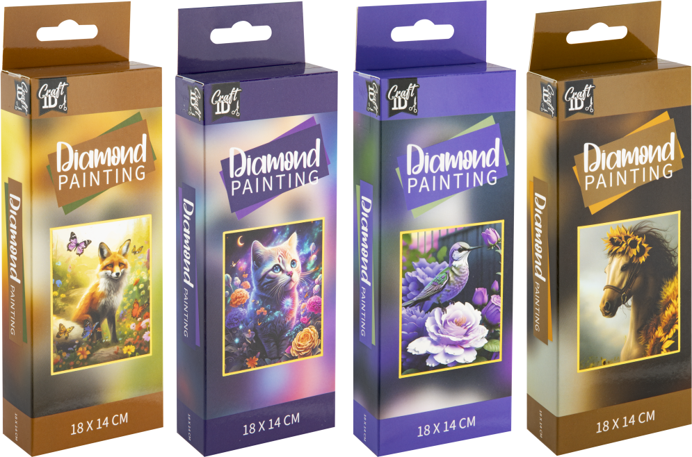 Vytvořte si vlastní třpytivý obrázek pomocí oblíbené techniky diamond painting!Každý set obsahuje vše potřebné k dokončení krásného obrázku s motivem zvířátek – liška, kočička, ptáček a koník. Balení obsahuje – samolepicí plátno s předtištěným motivem (18 × 14 cm), sada barevných akrylových „diamantů“, aplikátor (pero) na nanášení kamínků, voskový polštářek a miska na třídění kamínků.