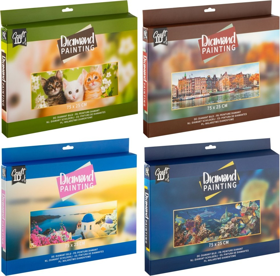 Pusťte se do tvorby detailního mozaikového obrazu pomocí techniky Diamond malování. Výsledná obrázek má velikost 75×25 cm. Sada obsahuje plátnos předtištěným vzorem a speciální lepící vrstvou, sadu barevných kamínků, aplikační pero, vosk a misku na kamínky. Ve čtyřech vzorech – koťátka, holandské město, podmořský svět a řecké moře.