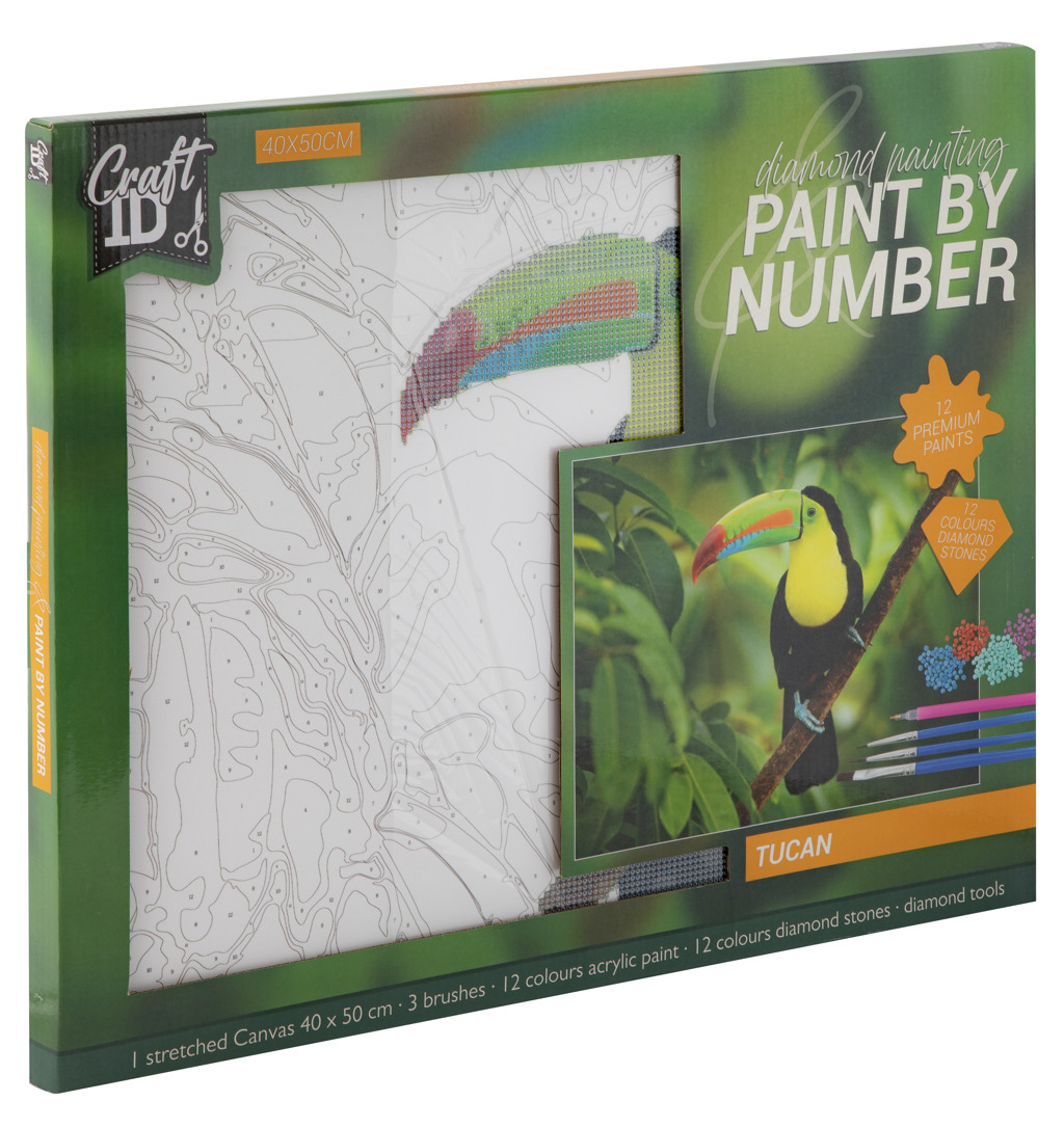 Malování pomocí kamínků Diamond/podle čísel Tukan 40×50 cm. Tento obrázek kombinuje dvě techniky pomocí kamínků a malování podle čísel. Součástí balení vodové barvy, štetec, aplikátor, kamínky a obrázek.