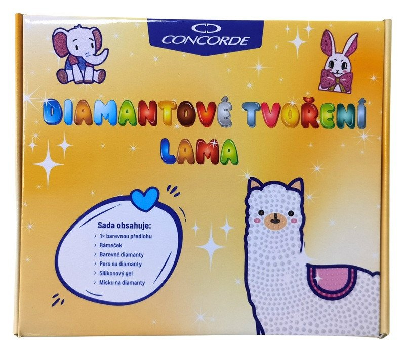 Diamantové tvoření s motivem lamy obsahuje barevnou předlohu, bílý rámeček, barevné diamanty, pero na aplikaci diamantů, silikonový gel a misku. Po odlepení průhledné ochranné fólie ze šablony se pomocí aplikačního pera a silikonového gelu nanášejí diamanty na odpovídající místa. Tvoření podporuje jemnou motoriku, trpělivost a rozvíjí kreativitu. Hotový obrázek v rámečku se stane krásnou dekorací.