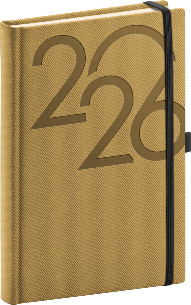 Denní diář Ajax 2026 ve zlaté barvě. Jemně strukturovaný povrch s atypickým reliéfem je vhodný pro všechny typy ražeb. Diář má zakulacené rohy, poutko na tužku a elastickou gumičku. Denní rozvrh s česko-slovenským kalendáriem a doplňkovou angličtinou, němčinou, maďarštinou a ruštinou. • kalendárium od prosince 2025 • měsíční plánovací kalendář 2026 • měsíční plánovací kalendář 2027 • roční plánovací kalendář 2026–2027 • pracovní plánovací kalendář • svátky České a Slovenské republiky a mezinárodní svátky • rozšířený seznam českých jmen • mapa České a Slovenské republiky • místo pro osobní údaje • textilní záložka • perforované růžky • prostor pro poznámky