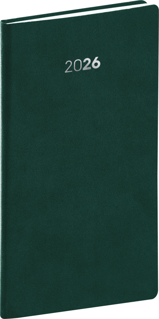 Plánovací kapesní diář Balakon 2026 v zeleném provedení, doplněný o stříbrný letopočet. Povrch diáře si získal oblibu díky kvalitnímu svrchnímu materiálu, který je extrémně odolný vůči vnějšímu poškození. Týdenní rozvrh s česko-slovenským kalendáriem a doplňkovou angličtinou, němčinou, maďarštinou a ruštinou. • kalendárium od prosince 2025 • roční plánovací kalendář 2026–2027 • pracovní plánovací kalendář • svátky České a Slovenské republiky a mezinárodní svátky • rozšířený seznam českých jmen • místo pro osobní údaje • perforované růžky • prostor pro poznámky