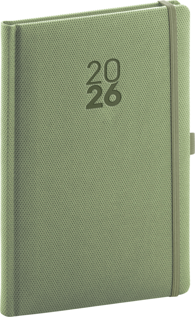 Týdenní diář Diamante 2026 v olivové barvě. Povrch diáře má jemnou strukturu připomínající výbrus diamantu a je ideální pro všechny typy ražeb. Diář má zakulacené rohy, poutko na tužku a elastickou gumičku. Týdenní rozvrh s česko-slovenským kalendáriem a doplňkovou angličtinou, němčinou, maďarštinou a ruštinou. • kalendárium od prosince 2025 • měsíční plánovací kalendář 2026 • měsíční plánovací kalendář 2027 • roční plánovací kalendář 2026–2027 • pracovní plánovací kalendář • svátky České a Slovenské republiky a mezinárodní svátky • rozšířený seznam českých jmen • mapa České a Slovenské republiky • místo pro osobní údaje • textilní záložka • perforované růžky • prostor pro poznámky