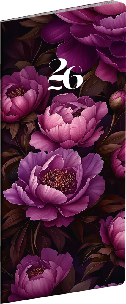 Praktický tenký diář s motivem fialových květů s měsíčním rozložením se vejde opravdu všude. Obsahuje české kalendárium se jmény, svátky a památnými dny, pracovní kalendář, seznam jmen a přehled na rok 2026 a 2027.