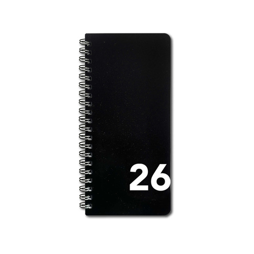 • Týdenní řádkové kalendárium. Jeden týden je vždy na dvou stranách. • České jmenné kalendárium • Pevné neprůhledné plastové desky • Rozměr 8,5 x 18,0 cm. • Záložková stužka pro snadnou orientaci. • Měsíční kalendář. • To do list a časový rozvrh. • Dvouletý přehledný kalendář na roky 2026 a 2027.