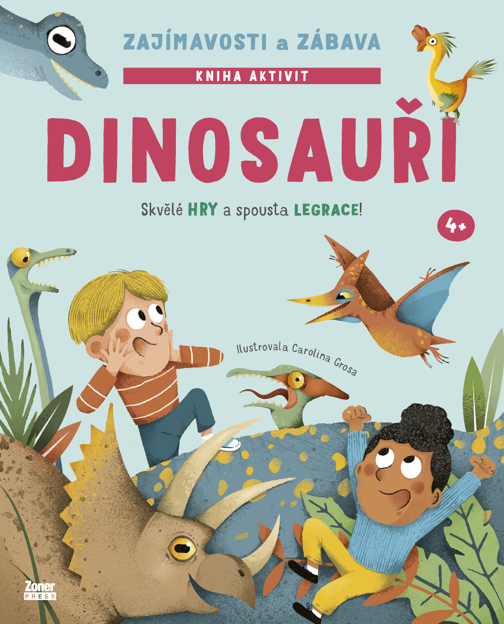 Fascinují vaše dítě dinosauři, ale na obsáhlé encyklopedie je ještě malé? V této knížce vás čeká ideální kombinace her a zajímavých informací, které malého zvědavce nebo malou vědkyni zaujmou i pobaví! Dinosauři: zajímavosti a zábava nabízí spoustu aktivit, při kterých dítě rozvíjí svou pozornost a logické myšlení, ale i paměť a jemnou motoriku. Můžete se těšit na barevné doplňovačky, vybarvování, bludiště, hledání rozdílů nebo třeba kreslení podle jednoduchých postupných kroků. To vše je doplněné o mnoho faktů týkajících se dinosaurů a paleontologie! Co jsou to fosilie a jak vznikají? Který dinosaurus měl na hlavě tvrdou kostěnou korunu a čím byl výjimečný tvor zvaný nanosaurus? Jak se jmenuje dinosaurus, který byl objeven jako první, a čím se živil pterodactylus? Tato kniha aktivit zodpoví nejen tyto, ale i spoustu dalších otázek! Užijte si tohle dobrodružství společně! Kniha je vhodná pro děti od 4 let. Ve stejné edici vyšla také Zvířátka: zajímavosti a zábava! O autorovi:Carolina Grosa se narodila v roce 1993 v Itálii. Pracuje jako grafická designérka a tvůrkyně grafických scénářů a věnuje se dětským ilustracím a ilustracím pro vydavatelství a školy. Vystudovala vizuální tvorbu a filmovou animaci v Turíně a získala diplom z experimentální kinematografie.