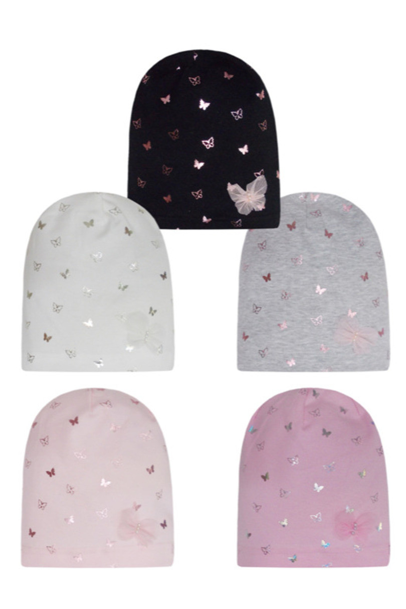 Dívčí tenká čepice z jednoduché bavlny s jemným lesklým potiskem motýlů a ozdobnou tylovou mašlí. Složení: 95% bavlna, 5% elastan