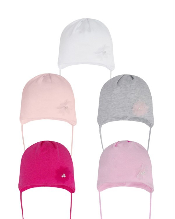 Dívčí čepice - svázané na krku - přední strana zdobená tylovou květinou - náhodně vybrané barvy: broskvová, růžová, světle šedá, fuchsiová, bílá Složení: 95% bavlna, 5% elastan