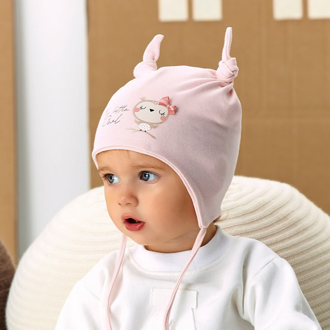 Dívčí čepice s uzly - svázané na krku - zdobené potiskem a mašlí - náhodně vybrané barvy: broskvová, růžová, světle šedá, fuchsiová Složení: 95% bavlna, 5% elastan