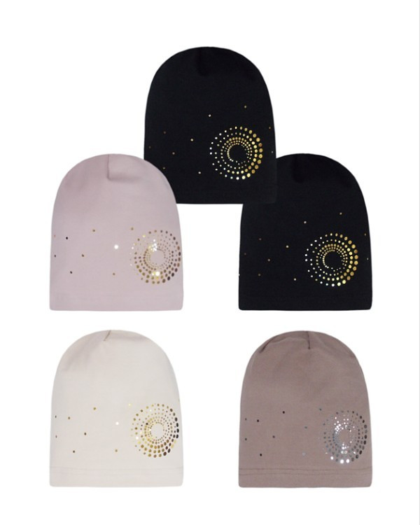 Dívčí bavlněná čepice - jedna vrstva - zdobené lesklým potiskem - náhodně vybrané barvy: vřesová, černá, růžová, béžová, moka Složení: 95% bavlna, 5% elastan