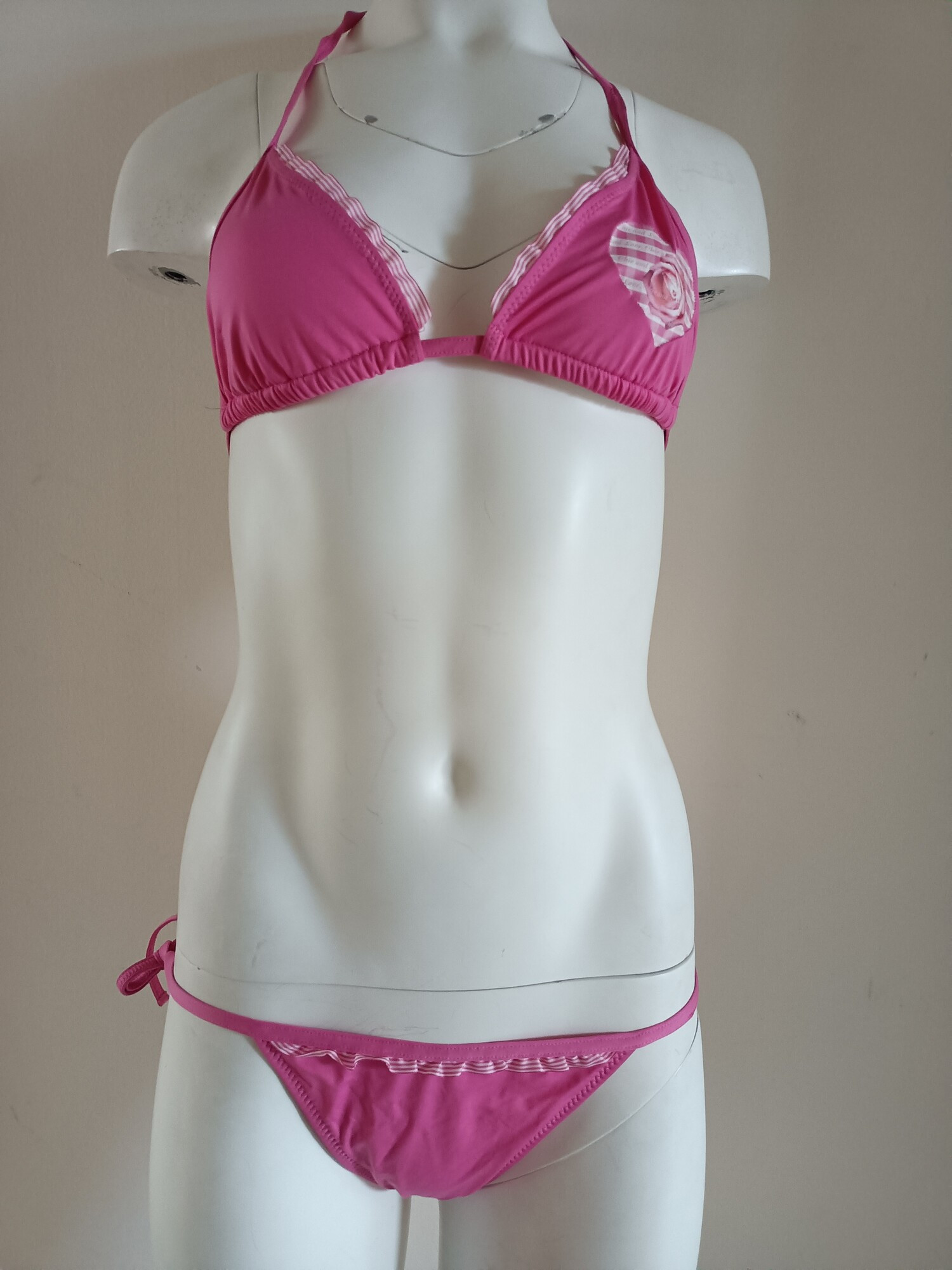 - Dívčí dvoudílné plavky. - Vrchní díl trojuhelníkového střihu, na posouvání. - Zavazování na zádech na za krkem - Spodní díl na zavazování na bocích Materiálové složení: 80% Polyamid, 20% Elastan
