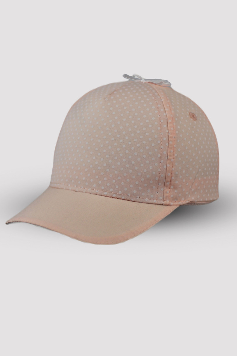 Dívčí baseballová čepice. Bílý puntíkatý potisk a ozdobná mašle na gór. Složení: 100% bavlna
