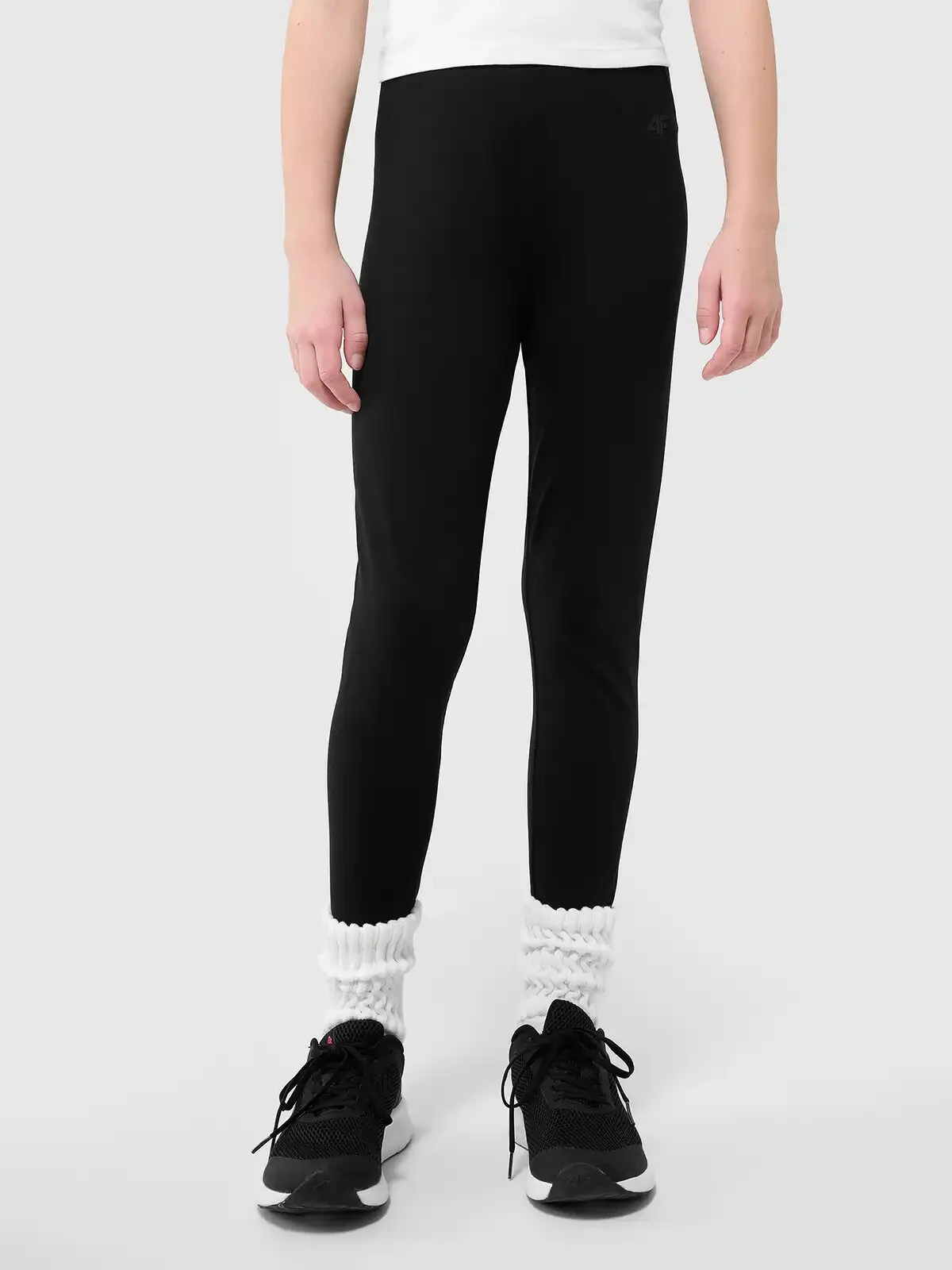 Dívčí pletené legíny jsou ideálním prvkem jak pro casualové, tak sportovní každodenní stylizace. Dívčí legíny pro každý den mají přizpůsobený střih slim, který přiléhá k tělu. Vazba single jersey s hladkým povrchem na jedné straně je elastická a pohodlná při nošení. Mají vysoký pás, který zůstává na místě a zajišťuje lepší krytí a nohavice s plnou délku, které sahají po kotníky. Dívčí legíny 4F jsou vyrobeny z 95% bavlny, díky čemuž je materiál měkký, odolný a příjemný na dotek. Díky přídavku elastanu (5%) jsou elastické a pohodlně sedí na postavě. Bez kapes. Elastická guma v pase zajistí přizpůsobení.