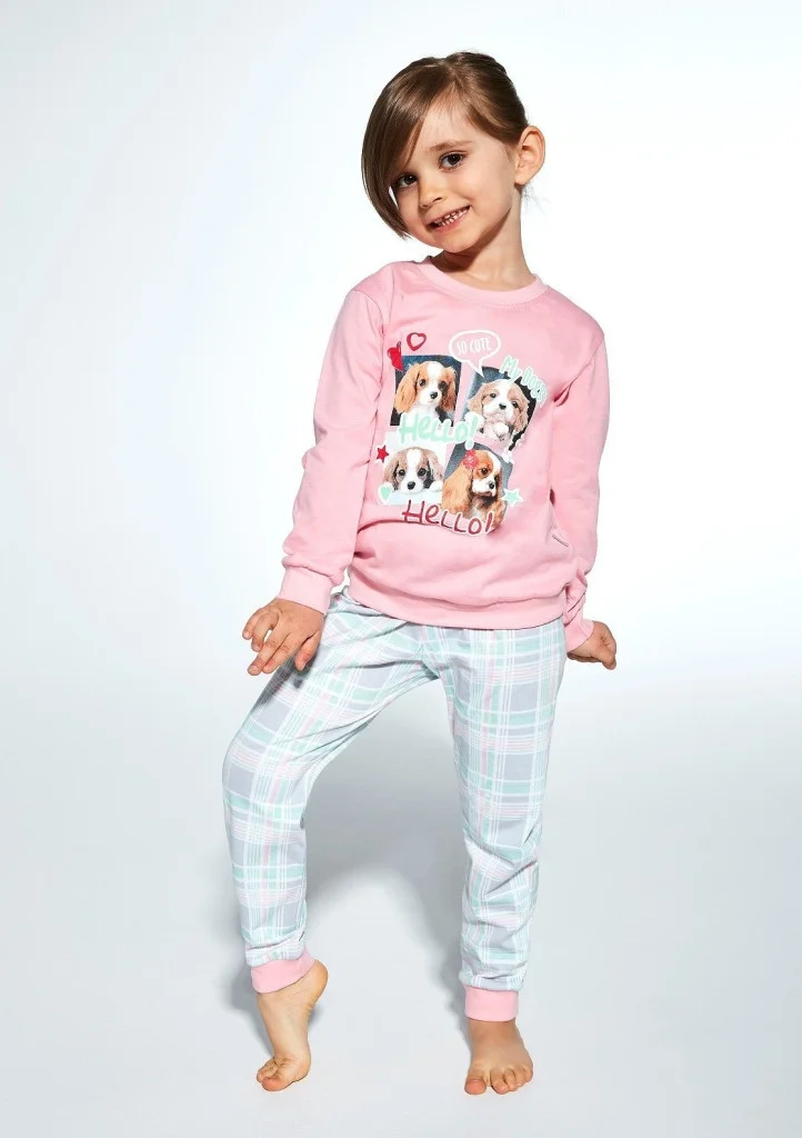 Dívčí bavlněné pyžamo od značky Cornette. Pyžamo má tričko s dlouhým rukávem a na přední části obrázek. Spodní díl je dlouhý s potiskem, v pase je měkká, široká guma. Na rukávech i na nohavicích je pohodlný úplet. Materiálové složení: 100% bavlna