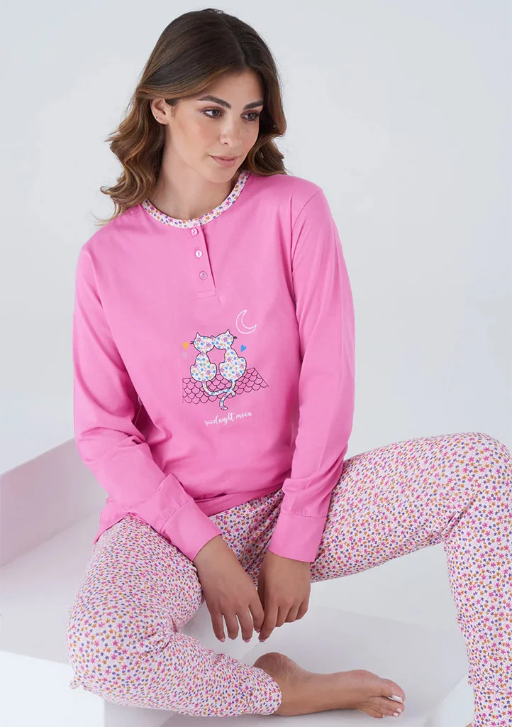 Roztomilé dětské pyžamo Karelpiu potěší každou malou slečnu! Horní díl s dlouhým rukávem zdobí veselé kočičky a nápis „Good night mom“, který navodí příjemnou večerní atmosféru. Barevně sladěné kalhoty jsou pokryté drobným květinovým vzorem, který krásně ladí s detaily u výstřihu. Pyžamo je vyrobeno z příjemné bavlny, která zajistí pohodlí po celou noc. Dostupné ve dvou variantách – růžové a modré. Materiálové složení: 100% bavlna.