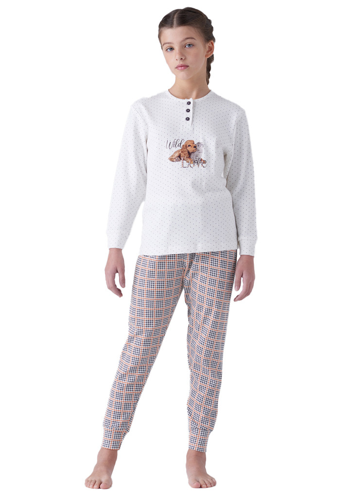 Dívčí bavlněné pyžamo značky Karelpiu. Pyžamo se skládá z trička s dlouhým rukávem, kde na přední straně je natištěná aplikace pejska a kočičky. Okolo krku je kulatý výstřih a léga s třemi knoflíky. Kalhoty jsou v pase do pružné obšité gumy, nohavice jsou ukončené do lemu ze stejného materiálu jako jsou kalhoty. Pyžamo je ušité z jemné, hřejivé bavlny. Materiálové složení: 100% bavlna