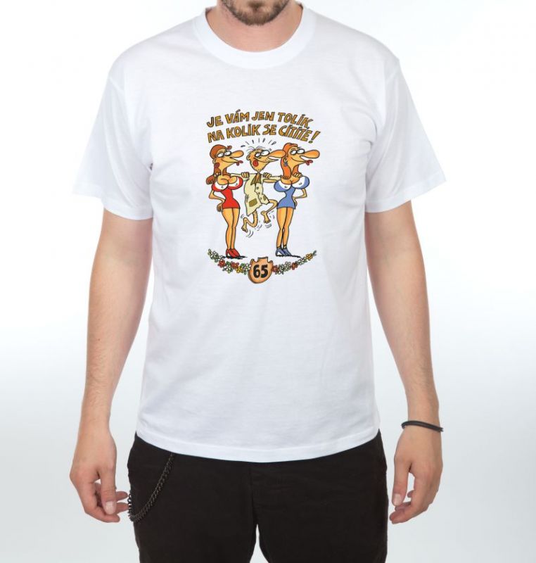 Toto bílé bavlněné tričko s vtipným nápisem „Je vám jen tolik, na kolik se cítíte“ a číslem dle jubilea je skvělým dárkem pro oslavence, který se cítí stále mladě.