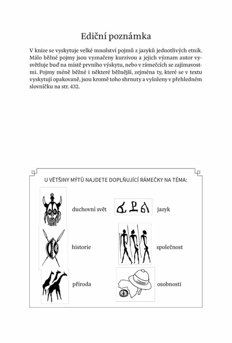 Vydejte se na cestu do duchovního světa etnik a národů AfrikyKniha doslova překypuje příběhy více než 120 etnik tajemné subsaharské Afriky. Pobavíte se bajkami, v nichž vystupují více i méně známá cizokrajná zvířata, humornými příběhy lidských i zvířecích šibalů, seznámíte se s mýty o vzniku světa, zvířat i lidstva a s historickými legendami. Objevíte, že také Afričané mají své hrdinské eposy a kouzelné pohádky. Navštívíte neúrodný Sahel, bohaté pobřeží Guinejského zálivu, súdánskou oblast ovlivněnou Egyptem, poutní místa v Africkém rohu, savany pod Kilimandžárem nebo pygmejská etnika ve střední Africe. Po stopách Emila Holuba doputujete k Zambezi, popovídáte si s mlaskajícími obyvateli jižní Afriky a proniknete i na Madagaskar s jeho ojedinělou zvířenou a prastarými tabu. Kniha je součástí edice Mýty a legendy. Faktografický kontext Každou kapitolu otevírá krátký úvod do historie regionu a kultury jeho etnik. Jednotlivé příběhy navíc doplňují tematické rámečky, jež pomáhají pochopit kontext vyprávění. Kniha byla odborně lektorována. Originální ilustrace a etnické motivy Výtvarník Vladimír Rimbala vytvořil pro knihu devět celostránkových ilustrací a řadu drobnějších poskytl ze svého archivu. Tento původem slovenský malíř a ilustrátor žil dlouhodobě v Norsku, cestoval po světě, až se nakonec usadil na severní Moravě. V tvorbě čerpá právě ze svých cest a svého zájmu o přírodu, paleontologii a historii, jež ho přivedly k unikátnímu stylu perokresby, kolorované perokresby a olejomalby. Zaměřuje se především na paleoart a na zoologickou ilustraci. Ilustroval přes 20 knih a účastnil se několika výstav. Knihu kromě toho doplňují kresby spojené s kulturou etnika nebo přímo původní etnické motivy. Autor Mgr. Ondřej Pivoda, Ph.D., je absolventem etnologie a baltistiky na FF MU v Brně. Přednášel na Ústavu klasických studií tamtéž a nyní se věnuje autorské tvorbě. Zabývá se jazyky a kulturou původních obyvatel, srovnávací mytologií, vztahy mezi přírodou a lidmi. Touto tematikou se zaobírá v knihách Liščí žena – mýty a legendy sibiřských národů (2018), Návštěva u Velkého kanibala – mýty a vyprávění archaických kmenů (2020) a v unikátní publikaci Jazyky domorodé Ameriky – historie a současnost (2023).