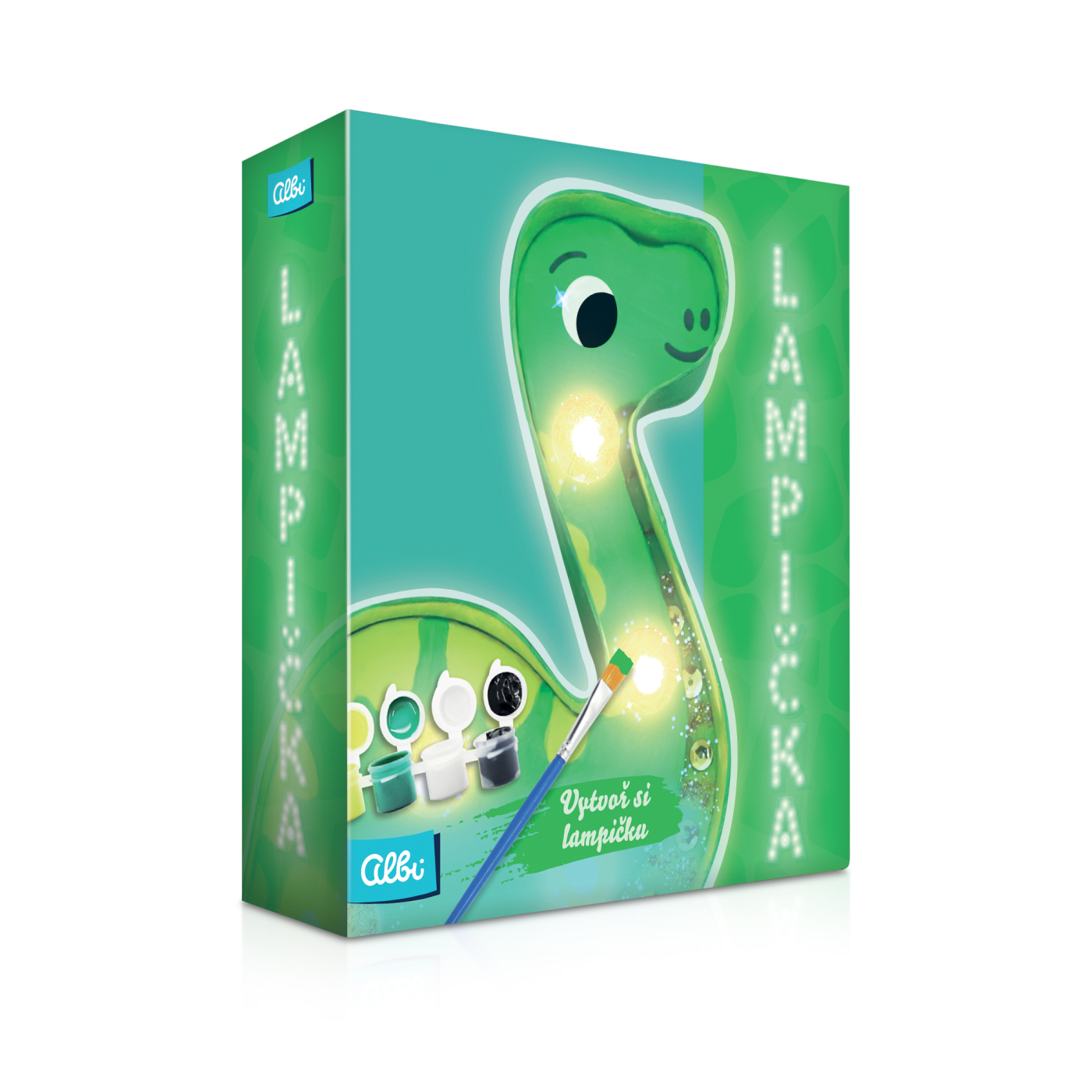 DIY lampičku ve tvaru dinosaura si mohou děti vyzdobit podle svého. Součástí sady je i pohádkové leporelo. Lampička je bezdrátová, baterie nejsou součástí balení. Balení obsahuje: karton ve tvaru dinosaura, 4 kalíšky akrylových barev, 1 štětec, třpytkové lepidlo, svítící řetěz s LED diodami, 5 plastových baněk na žárovky, 9 oboustranně lepících polštářků, třpytivá kolečka, 1 samolepkové oko, 2 samolepkové nozdry, 1 samolepkovou tlamičku.