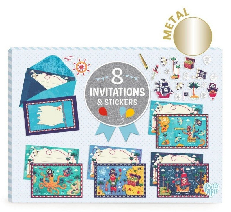 Vytvořte kouzelné pirátské pozvánky s naším tematickým setem!Set obsahuje:8 ilustrovaných karet s linkami – děti mohou pečlivě a snadno napsat jasné a čitelné zprávy.8 ilustrovaných obálek – dodají pozvánkám originální a kouzelný vzhled ještě před otevřením.2 archy samolepek – umožňují personalizaci každé pozvánky podle vlastní fantazie.Elegantní povrchová úprava kombinuje metalický efekt a matný tisk, který zvýrazňuje jednotlivé motivy a dodává pozvánkám originální a sofistikovaný vzhled.Vyrobeno z papíru a lepenky s certifikací FSC®, což zaručuje kvalitní a udržitelný materiál.