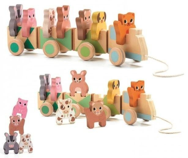 Zábavný vláček. Zvířátka se v různých kombinacích naskládají na vláček, který děti za sebou tahají.