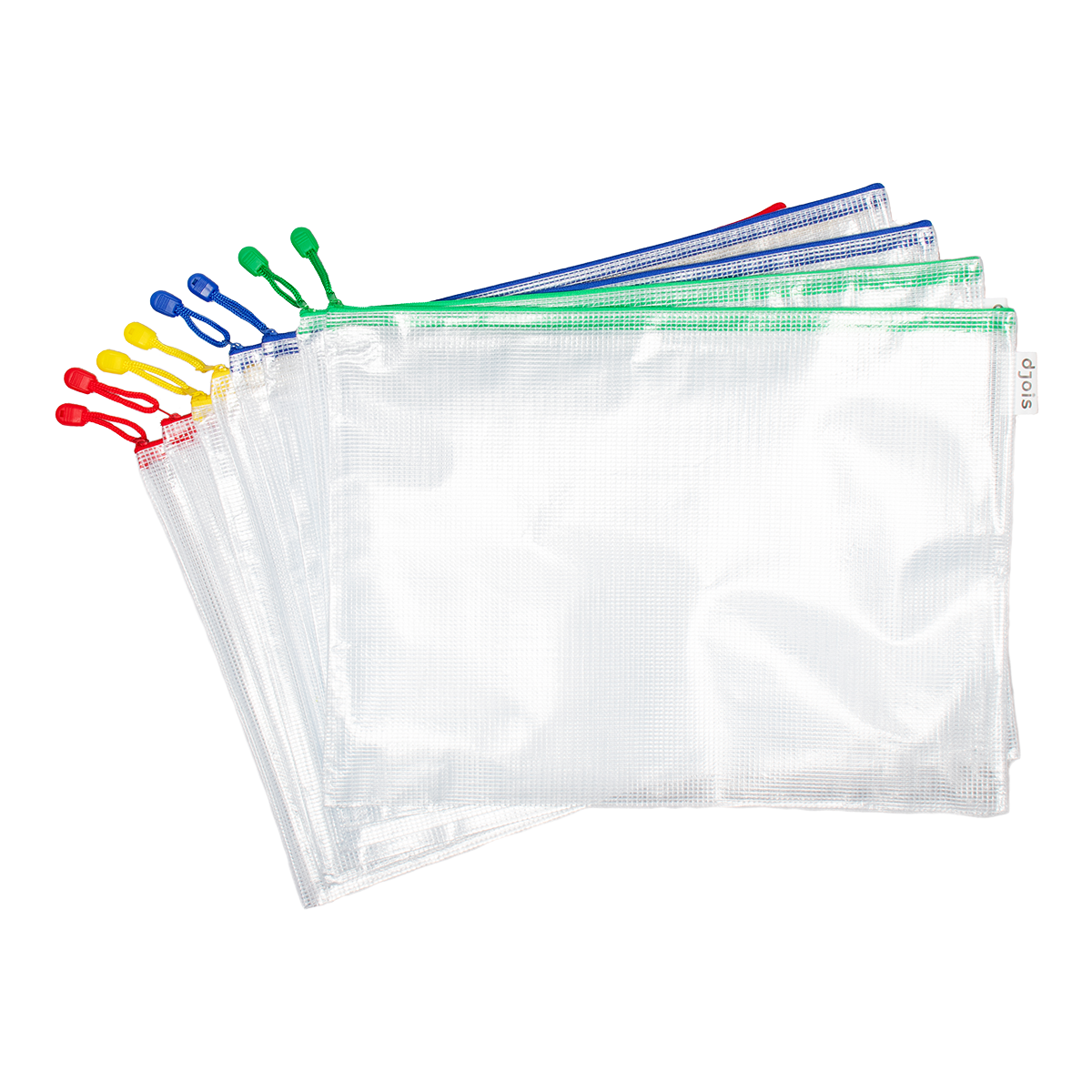 Vysoce odolná, poloprůhledná obálka se zpevňující síťovinou v atraktivních barvách. Vhodná pro tematickou organizaci dokumentů, školních pomůcek nebo větších předmětů. Barevný kovový uzávěr zipu s poutkem pro snadnou manipulaci. Boční poutko s logem je vhodné k uchycení pera.formát: A3rozměry: 330 × 450 mm; zapínání shoramateriál: odolné PVC (230 µm)mix barev: červená, modrá, žlutá, zelenátematická organizace dle barevodolné proti roztrženíbez obsahu ftalátůobsah balení: 8 ks