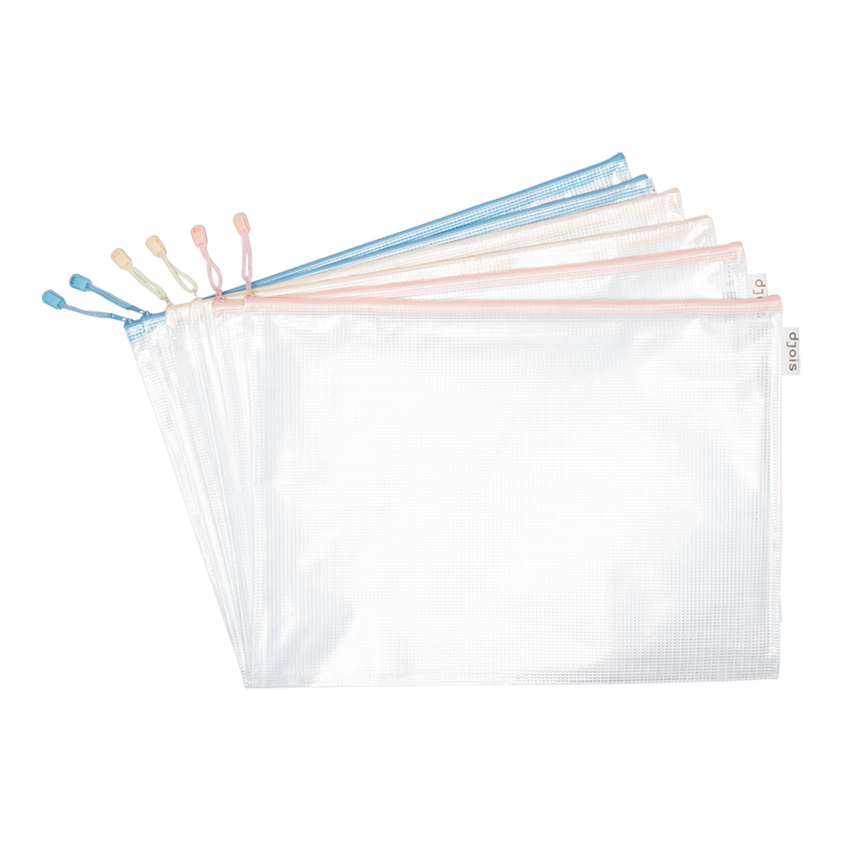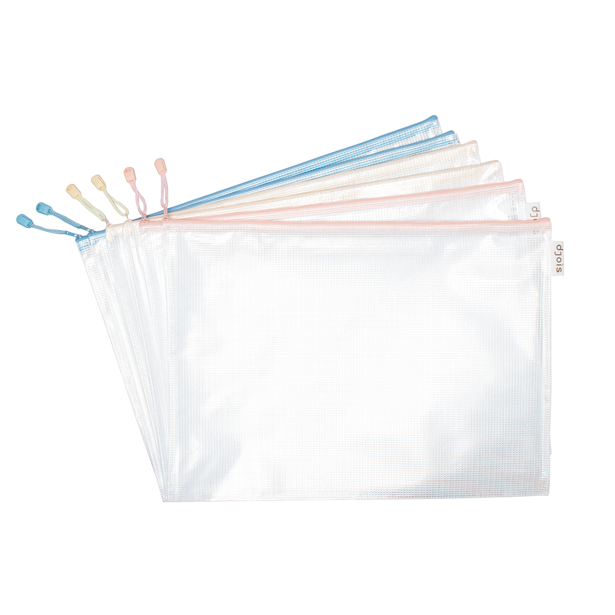 Vysoce odolná, poloprůhledná obálka se zpevňující síťovinou v atraktivních pastelových barvách. Vhodná pro tematickou organizaci dokumentů, školních pomůcek nebo větších předmětů. Barevný kovový uzávěr zipu s poutkem pro snadnou manipulaci. Boční poutko s logem je vhodné k uchycení pera.formát: A3rozměry: 330 × 450 mm; zapínání shoramateriál: odolné PVC (230 µm)mix pastelových barev: žlutá, růžová, modrátematická organizace dle barevodolné proti roztrženíbez obsahu ftalátůobsah balení: 6 ks