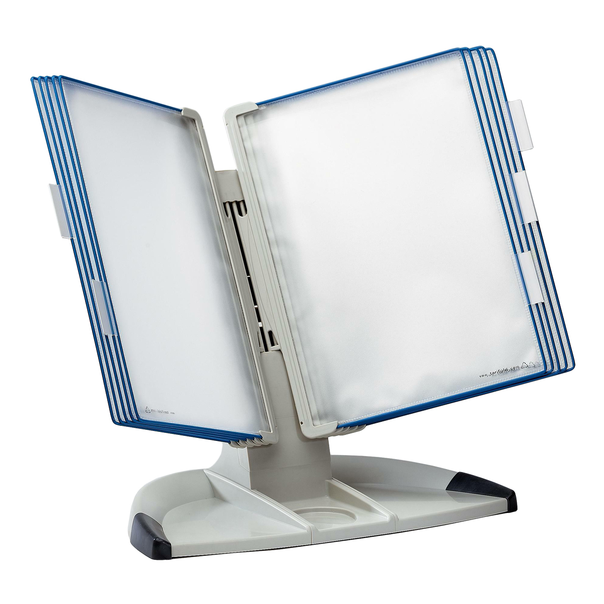 Kompletní pultový stojan s rámečky s kapsami k evidenci a prezentaci informací. Multifunční podstavec zajišťuje stabilitu a zároveň obsahuje praktické přihrádky k uložení kancelářských doplňků. Vhodné použití do kanceláří, na recepce, do vstupních hal, čekáren apod. Lze neomezeně rozšiřovat jeho kapacitu doplňkovým dílem pro rozšíření držáku Design.oboustranné rámečky s kapsami A4 a 5 indexovými záložkami, otevřené shoramateriál: stojan ABS plast, rámečky s kapsami ekologicky šetrný PPintegrované zarážkyocelové vyztužení rámečků s kapsamizáruka 10 let