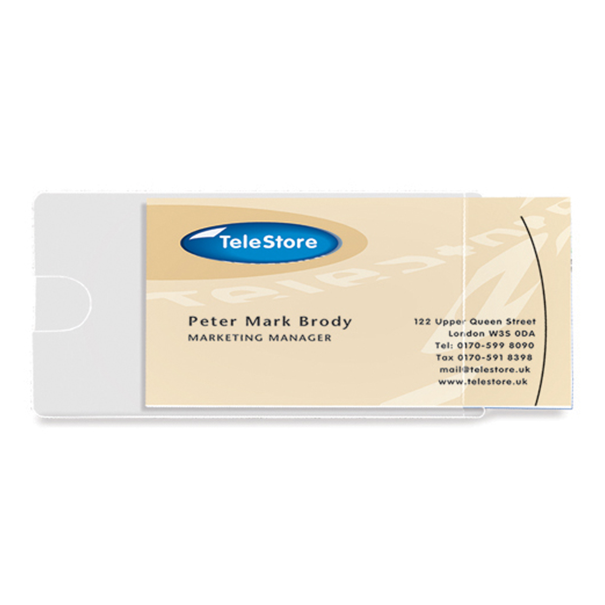 Průhledný obal k umístění vizitky. Zadní strana samolepicí. S otvorem pro snadné vyjmutí vizitky. Materiál: polypropylen 120 µm/100 µm zadní samolepicí strana. Určeno pro vizitky 90 x 56 mm. Rozměr: 95 x 60 mm. Balení: 100 ks.na vizitku v rozměru 90 x 56 mmotvor pro snadné vyjmutíotevřená kratší stranarozměr: 95 x 60 mm