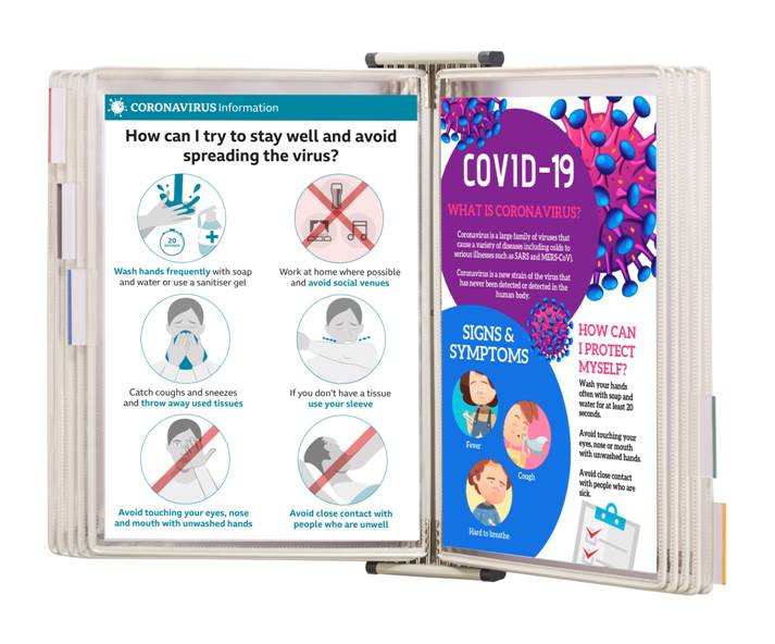 Kompletní nástěnný prezentační systém držáku a rámečků do prostředí náchylnému k šíření mikrobů - veřejná místa, nemocnice, kliniky, laboratoře, pohostinství a potravinářský průmysl. Obsahuje ionty stříbra, přírodní antimikrobiální činidlo, které deaktivuje usazené mikroorganismy (bakterie, plísně, kvasinky a viry). Stojan lze přikoupením doplňkových dílů rozšířit až na kapacitu 30 rámečků. Doporučeno obměňovat rámečky s kapsami každé 2 roky.oboustranné rámečky s kapsami A4 a 5 indexovými záložkami, otevřené shoradržák: kovový (RAL 7035), rámečky s kapsami: antibakteriální antireflexní PVCorientace vertikálníocelové vyztužení rámečků4 aretační zarážkydeaktivuje 99,99% všech mikrobů do 2 hodin (včetně COVID-19)ochrana 24/7obsah balení: 1 set