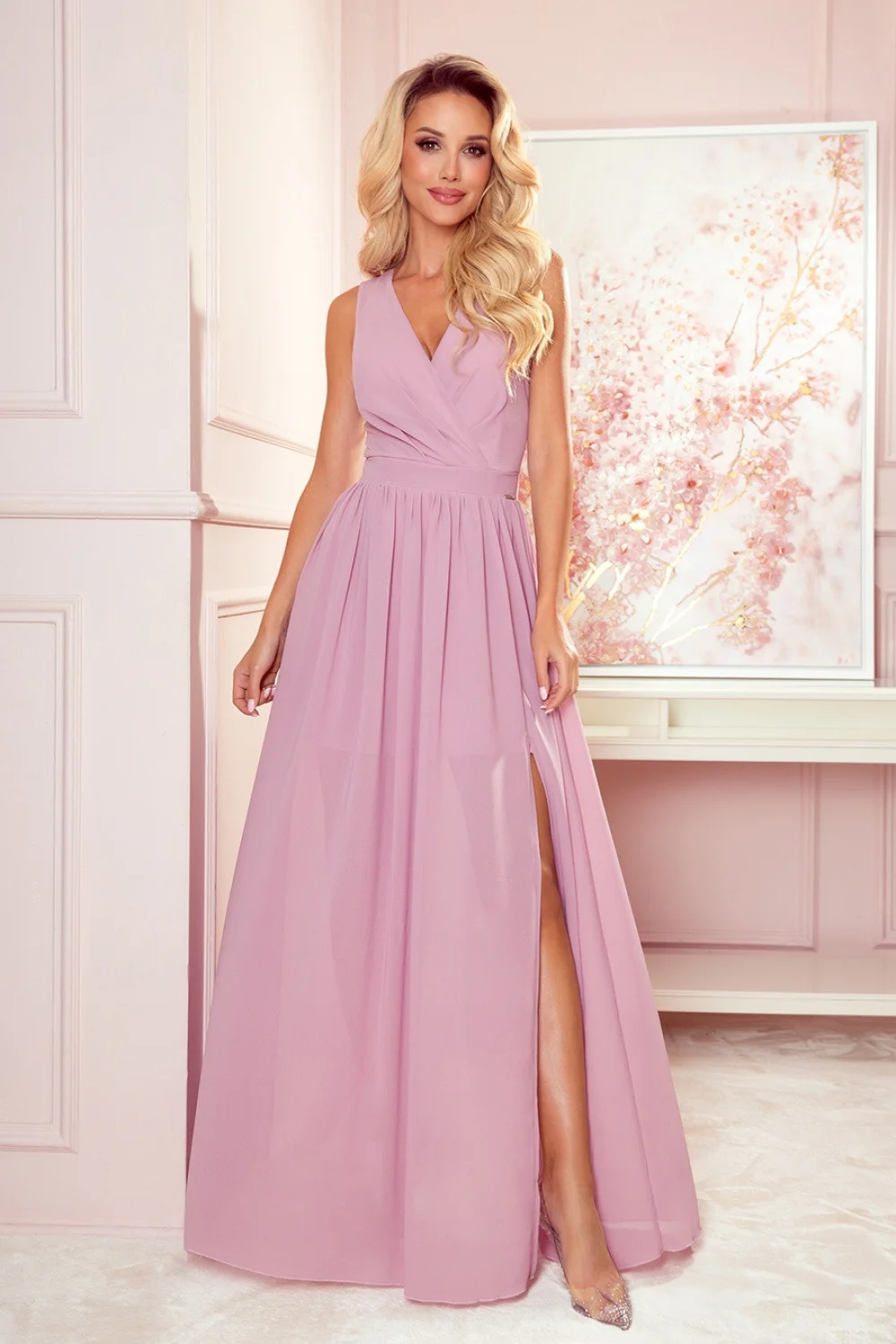 Dlouhé šaty s výstřihem, rozparkem na nohou a zavazováním na zádech. Je vyroben ze vzdušného materiálu v pudrově růžové barvě. Zapíná se vzadu na krytý zip. Polský výrobek. Značka numoco. Elastan 5 % Polyester 95 % Velikost DélkaObvod beder Obvod prsou Obvod v pase L153 cm124 cm90 cm82 cmM153 cm116 cm86 cm74 cmS150 cm112 cm84 cm70 cmXL155 cm128 cm94 cm86 cm