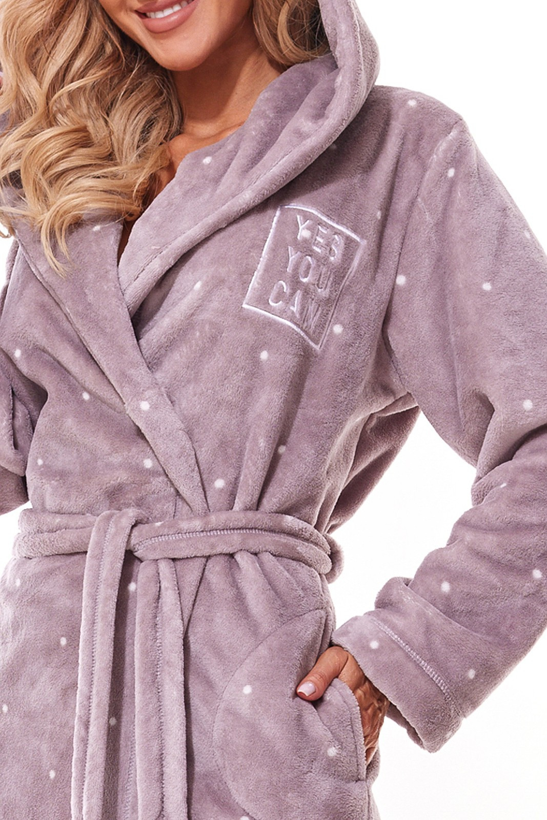 Dámský dlouhý župan s kapucí - z měkkého úpletu s bílými puntíky - ozdobná výšivka na hrudi - zavazování v pase, kapsy na bocích Složení: 100% polyester