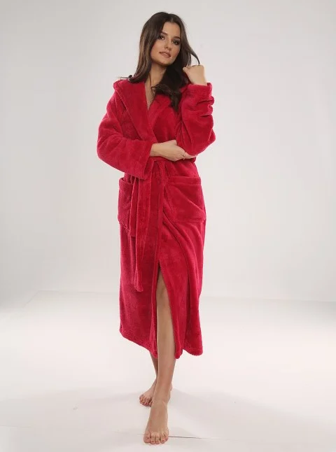 Pohodlný dlouhý dámský župan s kapucí. Župan je vyrobený z měkké tkaniny typu "soft". Model má kapsy a v pase se zavazuje. Složení: 100 % polyester.
