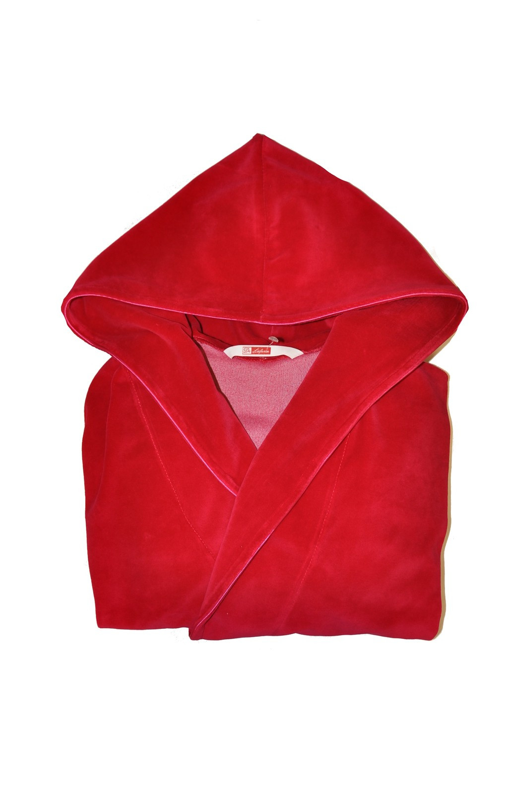 Dlouhý dámský župan, který je vyrobený z měkkého veluru příjemného na dotyk. Župan má kapuci, kapsy a v pase se zavazuje. Model je obšitý saténovou lemovkou. Na fotografii chybí kapuce. Složení: 80 % bavlna, 20 % polyamid.