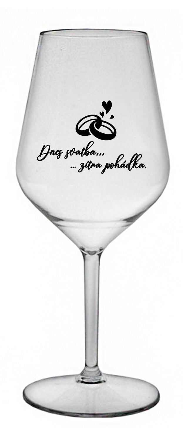 Objevte kouzlo Vašeho svatebního dne s našimi elegantními nerozbitnými sklenicemi na víno s motivem DNES SVATBA, ZÍTRA POHÁDKA. Tyto stylové sklenice kombinují praktičnost s nádherným designem, který dodá Vašemu stolu šmrnc. Sklenice jsou vyrobeny z kvalitního polykarbonátu, jsou lehké, odolné a bezpečné pro používání, což znamená, že se nemusíte bát o rozbití během tanečního večera nebo při oslavě s přáteli. Každá sklenice je zdobena jemnými svatebními motivy, které podtrhnou romantickou atmosféru Vašeho velkého dne. Ať už plánujete menší rodinný obřad nebo velkolepou svatbu, naše nerozbitné sklenice na víno jsou ideálním doplňkem pro každou příležitost. Připravte se na nezapomenutelné chvíle a objednejte si naše svatební nerozbitné sklenice ještě dnes! Vaše víno si zaslouží být podáváno s elegancí a bez obav z nehod.