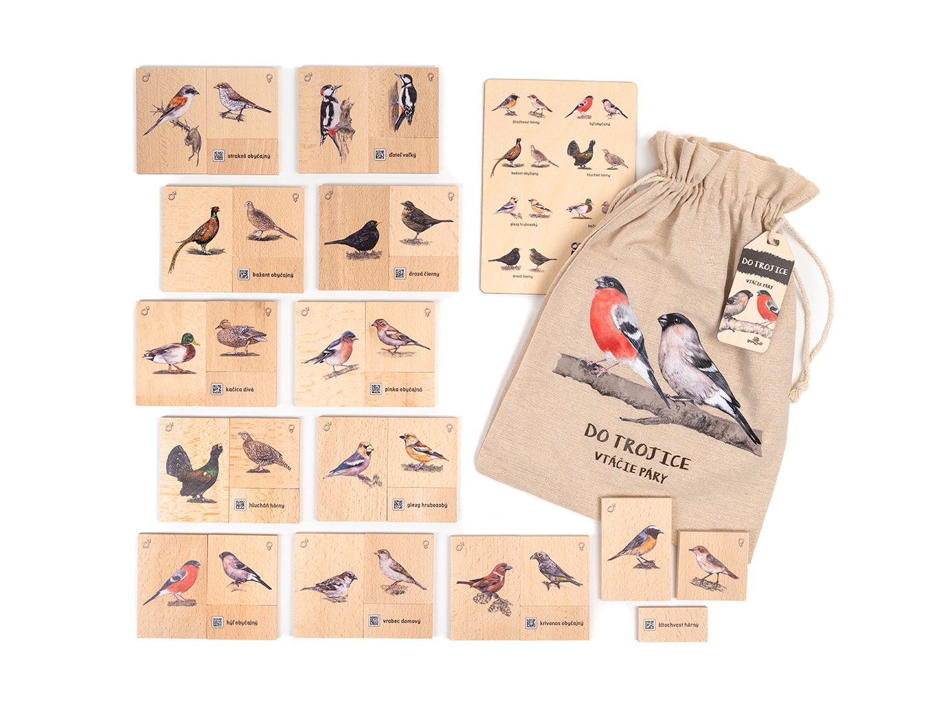 Poznávajte naše vtáky Objavte rozmanitý svet vtákov a premeňte učenie na dobrodružnú výpravu za poznaním! Výuková hra deti zoznámia s vtáčou ríšou. Cieľom edukačnej pomôcky je správne priradenie vtáčieho samca, samičky a názvu k sebe. Reálne ilustrácie našich operencov oboch pohlaví. Pomocou QR kódov zoznamuje deti so zvukovými prejavmi vtákov. Senzorické učenie podporuje sústredenie a pamäť. Jedna karta je s obrázkom samca, druhá s obrázkom samice a tretia s názvom vtáčieho druhu a zvukovým QR kódom pomocou ktorého si prehráte vtáčí hlas. Reálne ilustrácie umožňujú pozorovať a popisovať rozdiely medzi samcami a samičkami. Vtáčie páry z Lesného sveta Balenie obsahuje 36 herných kartičiek (12 trojíc). Rozmery: samec 10 × 6,8 cm, samička 6,8 × 6,8 cm, názov 6,8 × 3,5 cm Na kartičkách sú zvukové QR kódy, pomocou ktorých si prehráte vtáčie hlasy. Súčasťou balenia je doštička so správnym riešením. Balené vo vrecúšku o veľkosti 30 × 40 cm. Česká výroba z Hradca Králové s certifikáciou PEFC. Originálne obrázky od českých ilustrátorov. Druhy vtákov: ťuhík obyčajný, pinka obyčajná, strakapoud veľký, kos čierny, tetrov hlucháň, vrabec domáci, rehek záhradný, hýľ obyčajný, bažant obyčajný, dlask hrubozobý, krivka obyčajná, kačica divá Jirka Novák, maliar a ilustrátor Tvoria prevažne realistické kresby fauny a flóry. Ilustrátor učebných pomôcok, náučných tabúľ a hier s tématikou českých živočíchov. Viac o Jirkovi Zvuková ukážka Lesní svět · Rehek zahradní Varianty hry ✅ Klasické trojice. Klasické trojice. Kocky sú obrázkom hore. Pripraví sa 12 kariet so samčekmi. Hráči postupne dopĺňajú samičku alebo názov. Doplnenie správneho názvu má vyššiu hodnotu. ✅ Poznávanie vtákov podľa názvu. Kocky sú obrázkom hore. Pripravia sa iba karty s názvami. Hráči sa učia spájať vtáky do párov a určovať samčeka a samičku podľa názvu. ✅ Hádanie vtáčích hlasov. Kartičky s vtákmi rozložte obrázkom nahor. Môžete rovno pripraviť správne dvojice. Kartičky s názvami a QR kódy sú stranou. Púšťajte náhodný zvuk a ostatní hádajú, ktorý vták ho vydáva. Skvelý spôsob, ako trénovať sluch a naučiť sa rozpoznávať vtáky len podľa hlasu. Aplikácia Lesný svet Náučná aplikácia zadarmo na stiahnutie Kocky s názvom obsahujú aj QR kódy Po načítaní môžete prehrať zvuk zvieraťa Súčasťou je animácia a krátke rozprávanie Vyskúšajte, čo všetko vie * Aplikáciu sťahujte iba z oficiálnych obchodov Google Play alebo AppStore, kde je overená a dostupná vždy zadarmo. Od akejkoľvek inej aplikácie sa Lesný svet dištancuje a nenesie žiadnu zodpovednosť za jej použitie.