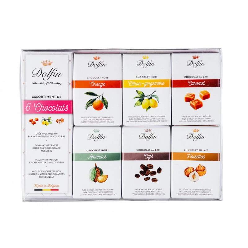 Kolekce 6 druhů čokolád 6 ks / 60g Abychom nabídli všem chuťovým buňkám umění ochutnávat a znásobili požitky, koncentruje své výjimečné know-how v minikazetě se 6 mini tabulkami čistého chuťového štěstí… Složení: cukr, kakaová hmota, kakaové máslo, sušené plnotučné MLÉKO, LÍSKOVÉ OŘECHY 4 %, MANDLE 4 %, karamel 4 % (cukr, glukózový sirup, sušené plnotučné MLÉKO, čerstvá smetana (MLÉKO), solené máslo (MLÉKO), guérandská sůl, emulgátor: řepkový lecitin), pomeranče 3 %, citron 2,5 %, káva 2 %, zázvor 1 %, guerandská sůl 0,2 %, emulgátor: SÓJOVÝ lecitin, přírodní aroma. Minimální podíl mléčné sušiny: 17,5 %. Minimální podíl kakaové sušiny: 37 % nebo 60 %. Může obsahovat stopy jiných stromových ořechů, pšenice, vajec a sezamu. Nutriční hodnoty ve 100 g: energetická hodnota 2253 kJ / 541 kcal, tuky: 34 g (z toho nasycené mastné kyseliny: 21 g), sacharidy 47 g (z toho cukr: 44 g), bílkoviny: 7 g, sůl 0,05 g. Vyrobeno v Belgii. Uchovejte v suchu a chladu.