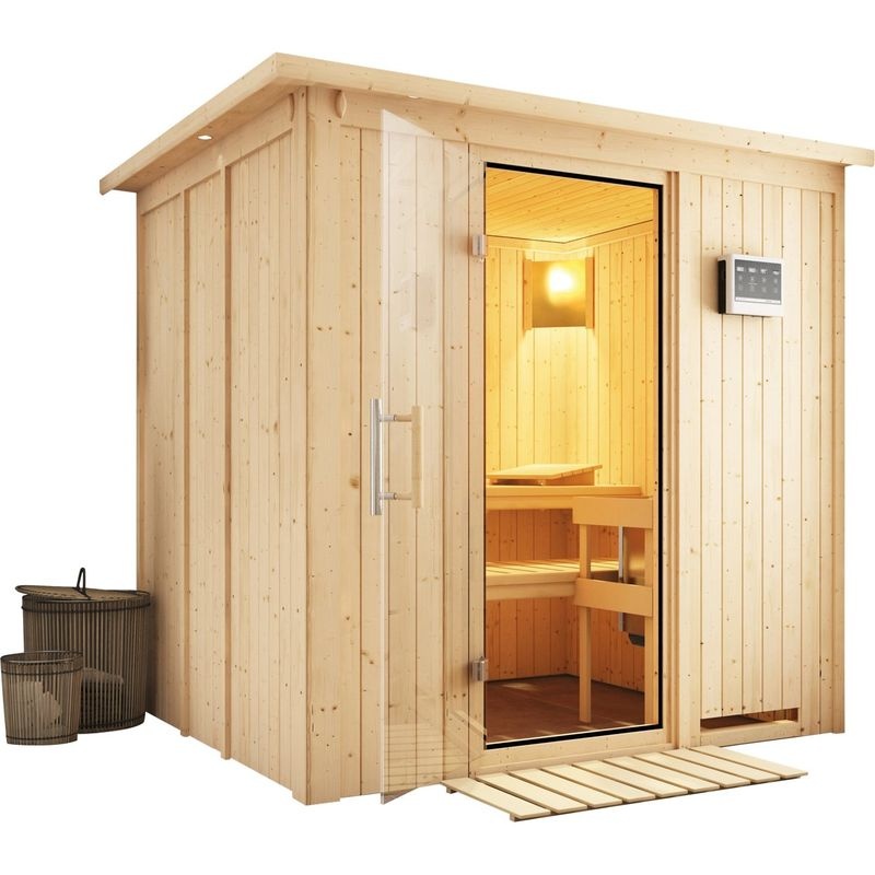 Interiérová finská sauna, síla stěny 68 mm, vnější rozměry 196 × 170 × 198 cm, určeno pro 2 osoby. Zakupte produkt Domácí finská sauna (75698) Karibu Sodin, rozměry š. 196 × d. 170 cm z kategorie Heureka.cz | Dílna, stavba, zahrada | Zahrada | Saunování | Infrasauny a sauny za cenu 60511 Kč.