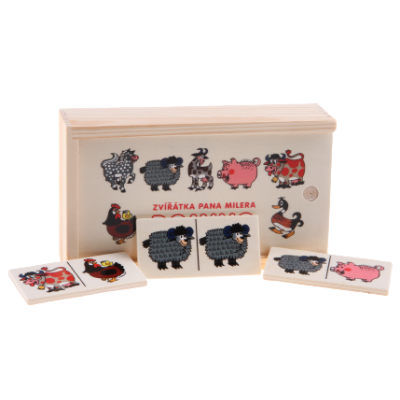 Klasická stolní hra domino se zvířátky kreslíře Zdeňka Milera. Je určena pro děti, kterým ještě nejde počítání teček na klasickém dominu. Obsahuje 28 dřevěných kartiček domina uložených v praktické dřevěné krabičce s víčkem o rozměrech 16×9×4,5 cm.