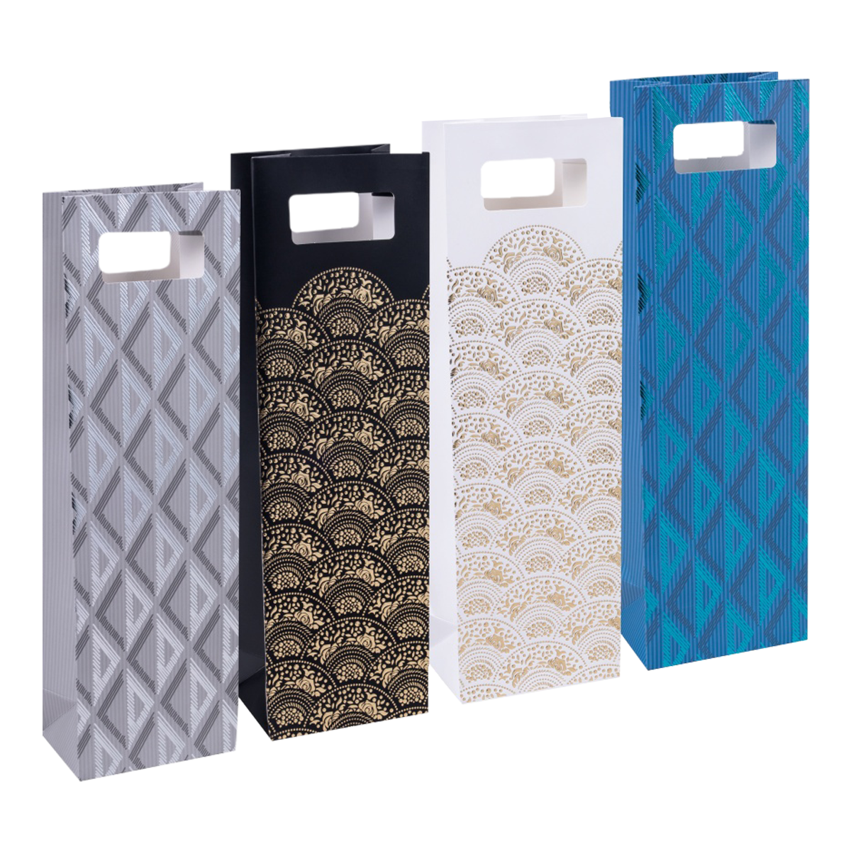 Sada kvalitních dárkových tašek určená pro balení 1 lahve vína či jiného nápoje. Laminovaný matný povrch je odolný proti oděru a poškození, atraktivní barvy a motivy. Zesílené dno, integrovaná rukojeť – výsek pro komfortní držení.rozměry: 12 × 41 cm; půdorys 5 × 8 cmmateriál: matný laminát, 210 g/ m2vhodná pro většinu slavnostních příležitostíodolná proti poškození, zesílené dnointegrovaná rukojeť – výsek pro pohodlné drženípro 1 láhev vína nebo jiného nápojemix 4 motivůobsah balení: 12 ks