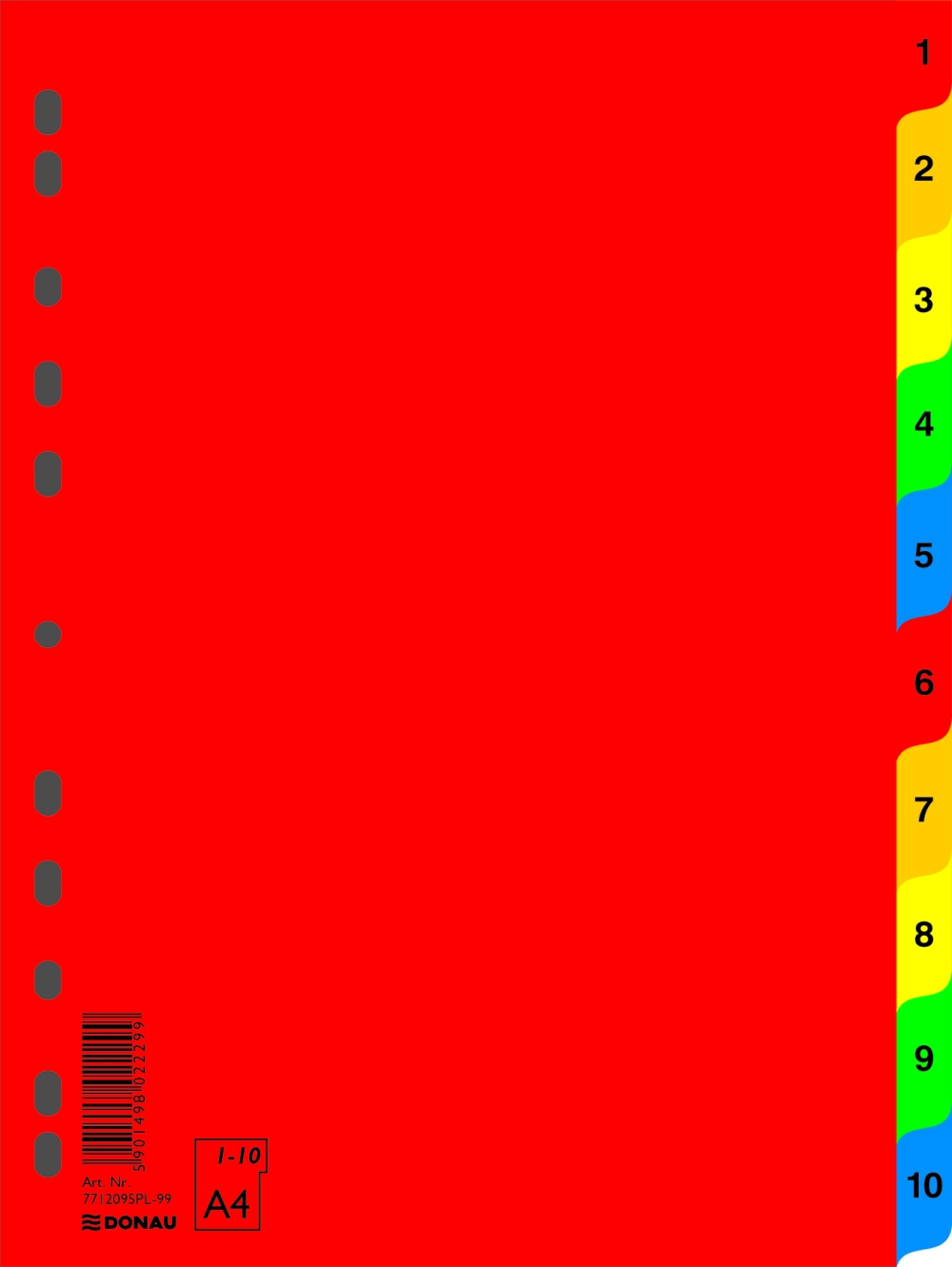 rozměry: 230 x 297 mmmateriál: PP, 120 μm, výrobek je šetrný k životnímu prostředíformát A4barvy stránek: červená, oranžová, žlutá, zelená, modrá11 perforovaných otvorůobsah balení: 10 ks
