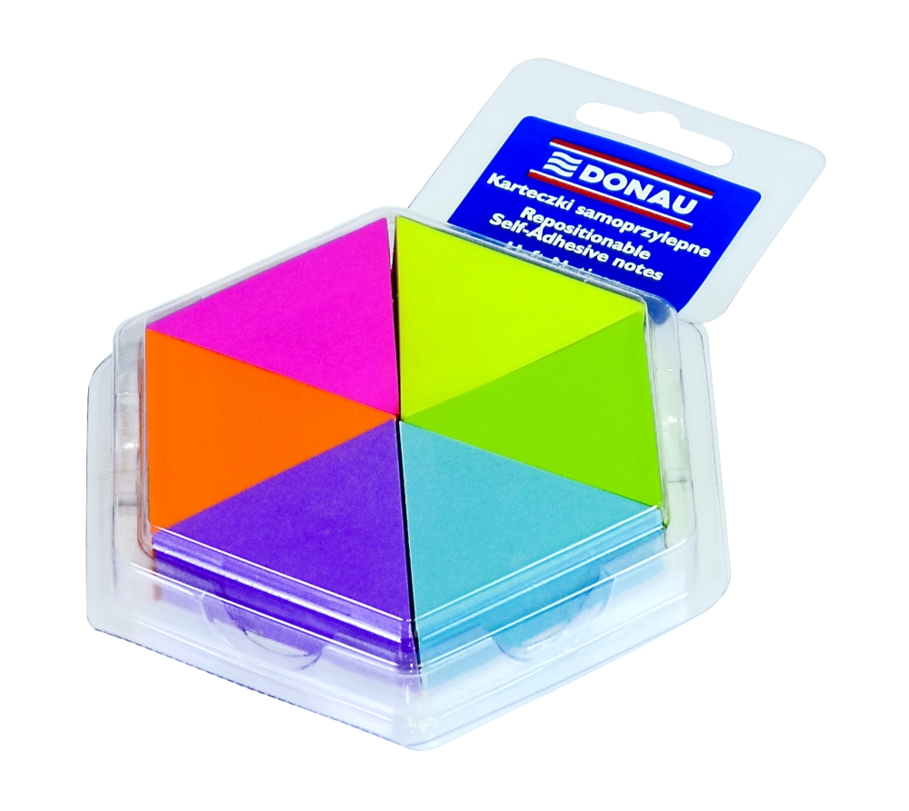 Samolepicí bločky trojúhelníkového tvaruve výrazných barvách pro organizaci poznámek a záložek. Samolepicí pruh s lepidlem na vodní bázi přilne na většině povrchů. Bločky jsou atypicky umístěny do praktického plastového zásobníku.počet lístků: 900 ksrozměry: 50 x 43 mmmix neonových barev: růžová, oranžová, fialová, sv. zelená, tm. zelená, modrálepidlo na vodní báziobsah balení: 6 ks