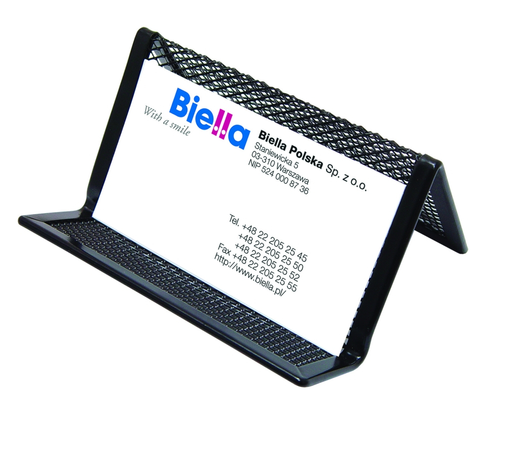 Jednoduchý kovový stojánek na vizitky je elegantním doplňkem do kanceláře a home office. Pevná a stabilní konstrukce.rozměry: 95 x 75 x 45 mmbarva: černámateriál: lakovaný kovkombinovatelný s kolekcí Office Setodolný proti poškození, zaolbené rohyobsah balení: 1 ks