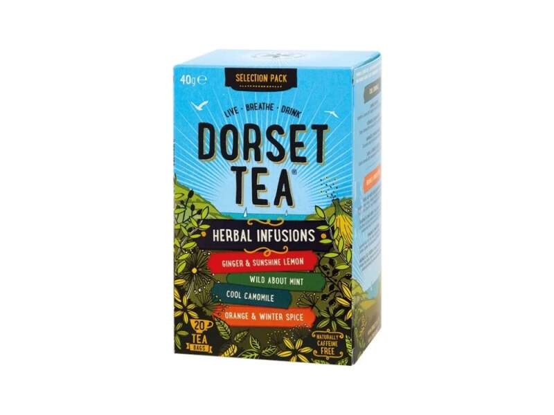 DORSET čaje inspirované životem a krásou čisté přírody.Tradice od roku 1934. Bylinná kolekce obsahuje 4 druhy čajů Citrón se zázvorem (Složení: Jablečná dužina, ostružinové listí, citrónová příchuť 10%, kyselina citrónová, citrónová kůra 5%, citrónová tráva 5%, limetková příchuť 5%, čekankový kořen) Máta Heřmánek Pomeranč a zimní koření (Složení: Jablečná dužina, skořice 14%, ostružinové listí, ibišek, čekankový kořen, kyselina citrónová, zázvor 4%, pomerančová příchuť 3%, pomerančová kůra 2%, hřebíček 2%.) Kromě výběru skvělých ingrediencí se společnost Dorset snaží přispět také k životnímu prostředí.Chrání přírodu kolem nás, protože vědí, že na každý šálek čaje je potřeba mít vodu i půdu čistou, aby chutnal tak jak opravdu má. Proto také používají čajové sáčky a obaly, které jsou 100 % biologicky rozložitelné a lze jej průmyslově kompostovat.