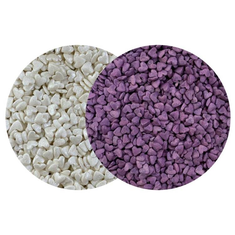 Cukrová dekorace v podobě bílých perleťových a fialových srdíček. Použití: Vhodné na zdobení drobného cukroví např. vánočního nebo svatebního, dortových lízátek či nanuků, zákusků, řezů, dortů, pralinek a muffinů. Dekorace je umístěna v praktických průhledných dózičkách, které zaručí bezpečné a přehledné uskladnění.Složení: bílý cukr, pšeničná mouka, melasa, mastek, leštící látka Capol, rafinovaný palmový olej, modifikovaný škrob, zahušťovadla E415, E412, E466, stříbrný lesk, barviva E122, E132 Nutriční hodnoty ve 100 g: energie 1570 kJ/375 kcal, tuky 5,5 g (z toho nasycené 1,5 g), sacharidy 90 g (z toho cukry 87 g), bílkoviny 4,5 g, sůl 0,01 g EAN: 2025000008144