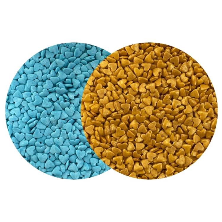 Cukrová dekorace v podobě modrých a zlatých srdíček. Použití: Vhodné na zdobení drobného cukroví např. vánočního nebo svatebního, dortových lízátek či nanuků, zákusků, řezů, dortů, pralinek a muffinů. Dekorace je umístěna v praktických průhledných dózičkách, které zaručí bezpečné a přehledné uskladnění.Složení: bílý cukr, pšeničná mouka, melasa, mastek, leštící látka Capol, rafinovaný palmový olej, modifikovaný škrob, zahušťovadla E415, E412, E466, stříbrný lesk, zlatý lesk, barviva E132, E133 Nutriční hodnoty ve 100 g: energie 1570 kJ/375 kcal, tuky 5,5 g (z toho nasycené 1,5 g), sacharidy 90 g (z toho cukry 87 g), bílkoviny 4,5 g, sůl 0,01 g EAN: 2025000008175